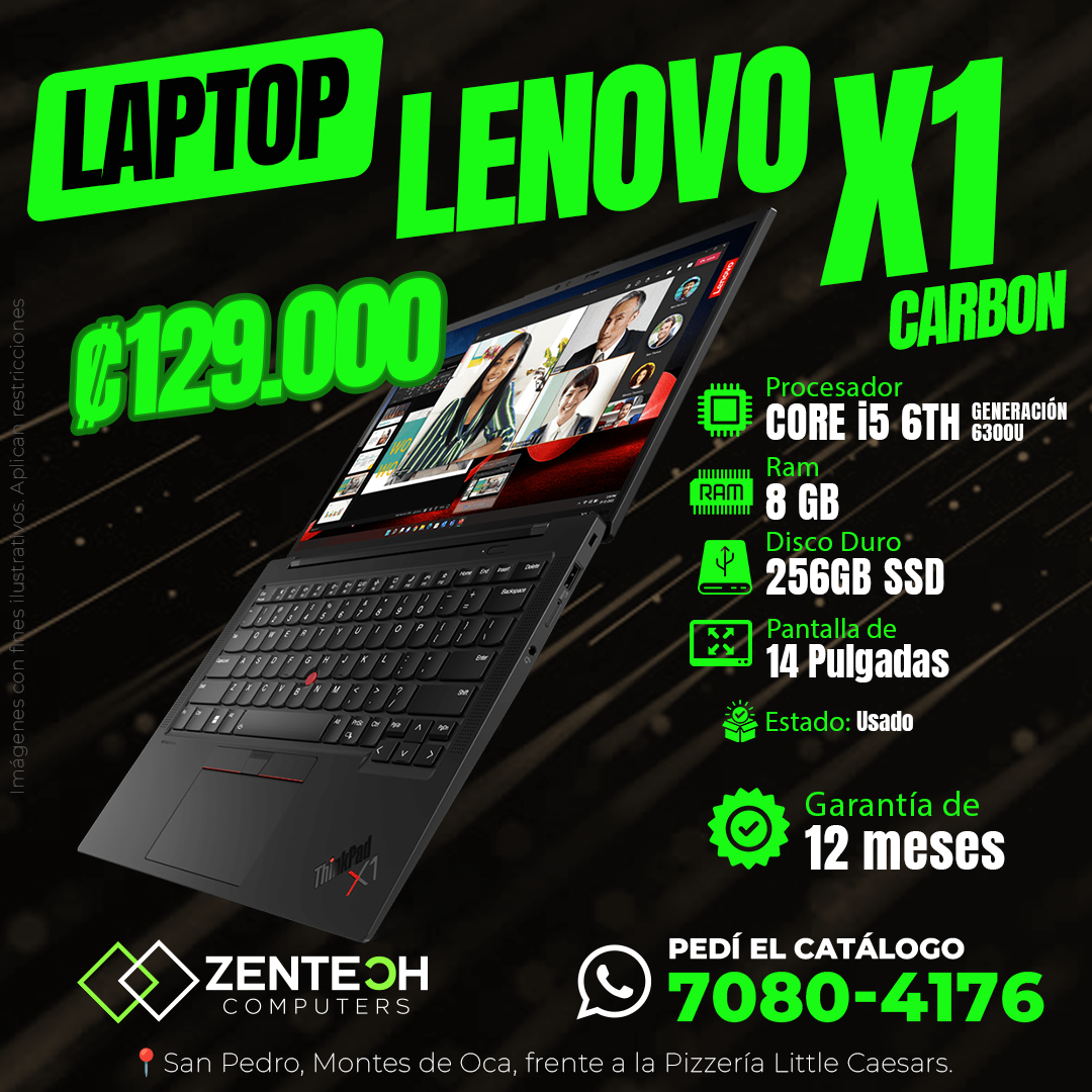 ¡Llévate la ultrabook LENOVO X1 Carbon usada a un precio insuperable! Ideal para ejecutivos y máxima portabilidad. Con Core i5 6ta Gen, 8 GB RAM y 256 GB SSD. Pantalla de 14 pulgadas y 12 meses de garantía. ¡Diseño de fibra de carbono!